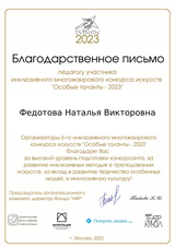 2023 год Указом Президента России Владимира Путина объявлен Годом педагога и наставника. Подопечные Подлесновского дома-интерната для престарелых и инвалидов вместе со своими наставниками принимали активное участие в инклюзивном многожанровом конкурсе искусств «Особые таланты - 2023г.», проводимом Национальным фондом развития реабилитации (город Москва), который был посвящен реабилитации и качеству жизни различных категорий граждан с ОВЗ. В конкурсе принимали участие 7 получателей социальных услуг Подлесновского дома-интерната, с ограниченными возможностями здоровья и особенностями психики. В этом году инклюзивный конкурс искусств был очень масштабный и многочисленный, охвачено более ¾ субъектов РФ, принято и обработано свыше 5,5 тыс. заявок в 11 номинациях, количество участников превысило 11 тыс. человек, вместе со своими подопечными участвовало свыше 5 000 педагогов и наставников, конкуренция была высока как никогда. В результате подведения итогов конкурса Подлесновские получатели социальных услуг получили и призовые места: 1. В номинации «Изобразительное искусство: портрет» во взрослой группе I место присуждено получателю социальных услуг Першину Виктору Федоровичу, кружок «Жизнь в красках», за предоставленную на конкурс работу «Портрет певца-гусляра Михаила Константиновича Северского». 2.В номинации «Художественное слово: Произведения собственного сочинения» в Молодежной группе II место присуждено получателю социальных услуг Трегубову Алексею с. Подлесное Марксовский район Саратовская область, за произведение «Героям фронта и тыла». 3.Специальными дипломами награждены получатели социальных услуг взрослой группы участников 61 плюс в номинации «Декоративно-прикладное искусство» - Мельникова Ольга Ивановна с работой «Корзинка фруктов» и Мисюрова Валентина Михайловна с работой "Кошачая семейка», выполненных в технике лепка из соленого теста. 4.Коллектив получателей социальных услуг ГАУ СО "Подлесновский дом-интернат для престарелых и инвалидов" с. Подлесное, также отмечен специальным дипломом за работу в технике «Гравировка по стеклу», за представленные работы «День защитника Отечества» и «Герб РФ». 5.Наставники учреждения Федотова Наталья Викторовна и Рязяпова Любовь Николаевна получили благодарственные письма за подготовку участников конкурса. 6.Сертификаты участников конкурса в молодежной группе получили Швечихин Андрей, Седин Дмитрий, Воробьева Галина. Результаты конкурса и списки победителей опубликованы в соответствии с графиком проведения на официальной странице конкурса: https://clck.ru/33RpUC А также в наших социальных сетях на страницах Национального фонда развития реабилитации: https://t.me/fondnfr https://clck.ru/YU33p